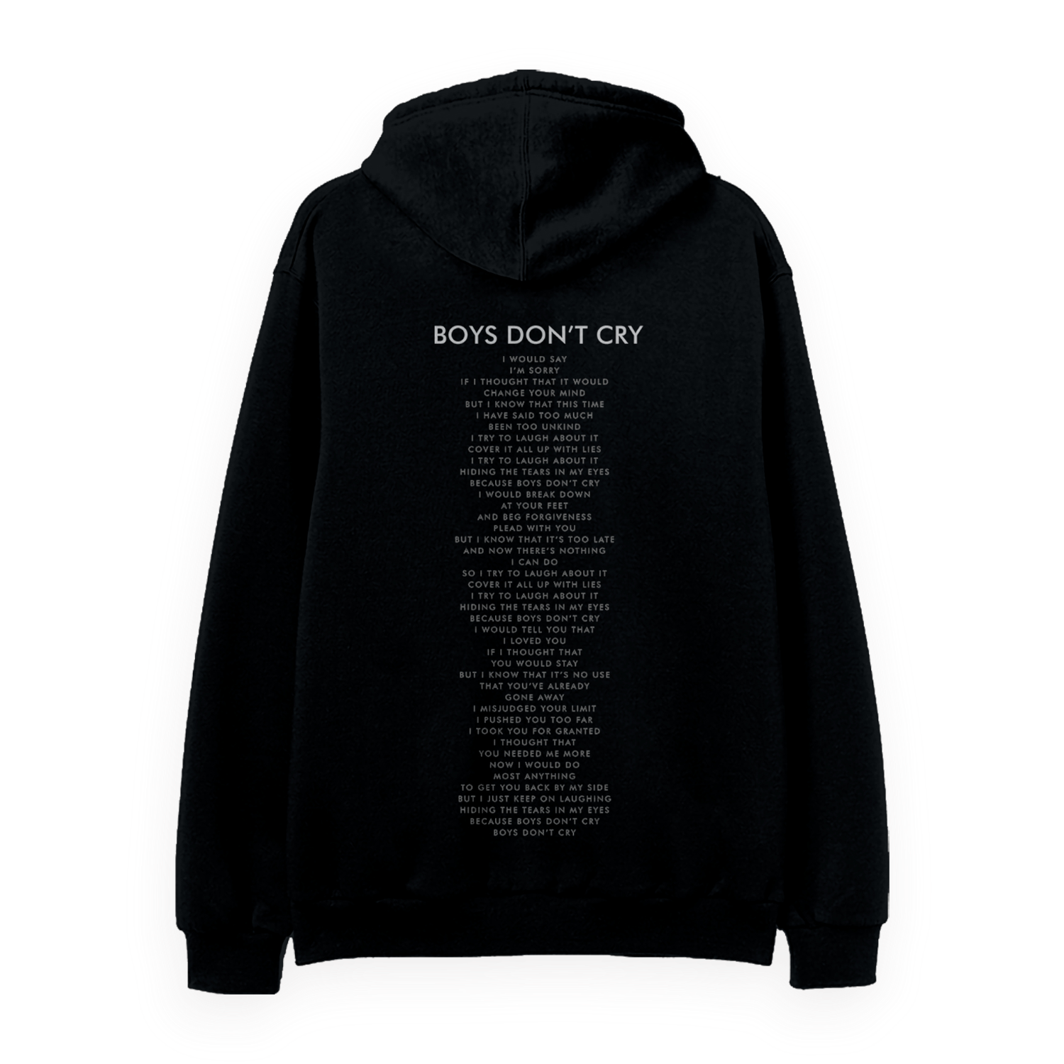 Classic fitting unisex pullover hoodie in black featuring a design inspired by The Cure's single "Boys Don't Cry" printed on the front and back. Constructed from 50% cotton, 50% polyester.