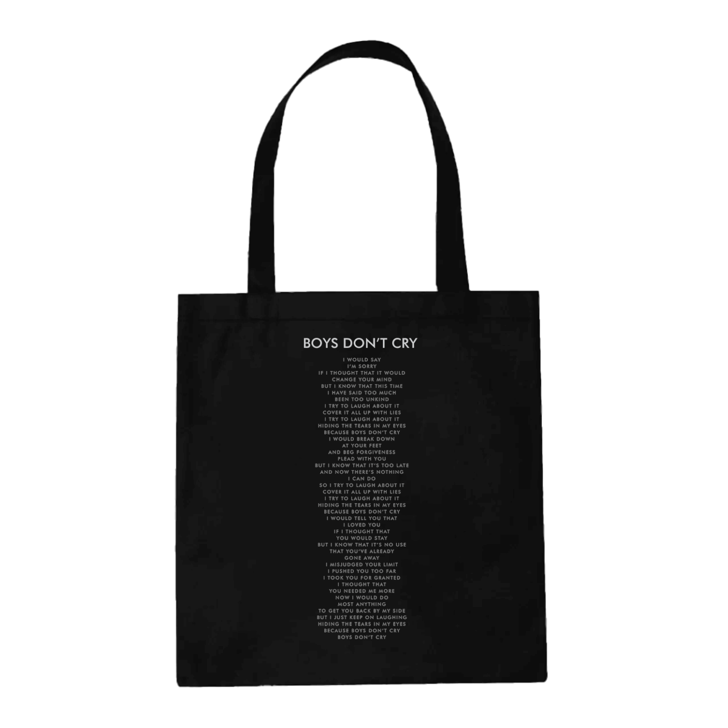Black tote bag featuring a design inspired by The Cure's single "Boys Don't Cry".