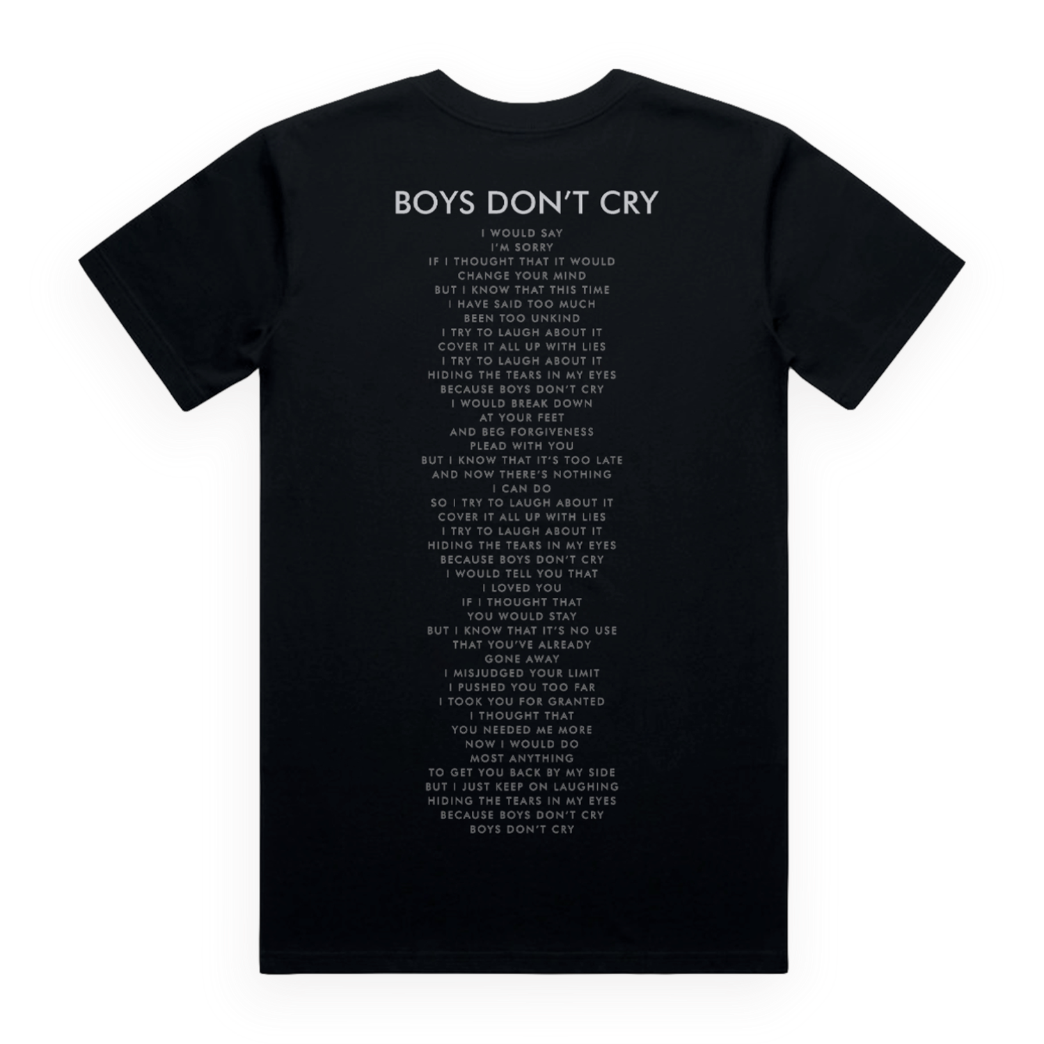 Classic fitting unisex v-neck tee in black featuring a design inspired by The Cure's single "Boys Don't Cry" printed on the front and back. Constructed from 100% cotton.