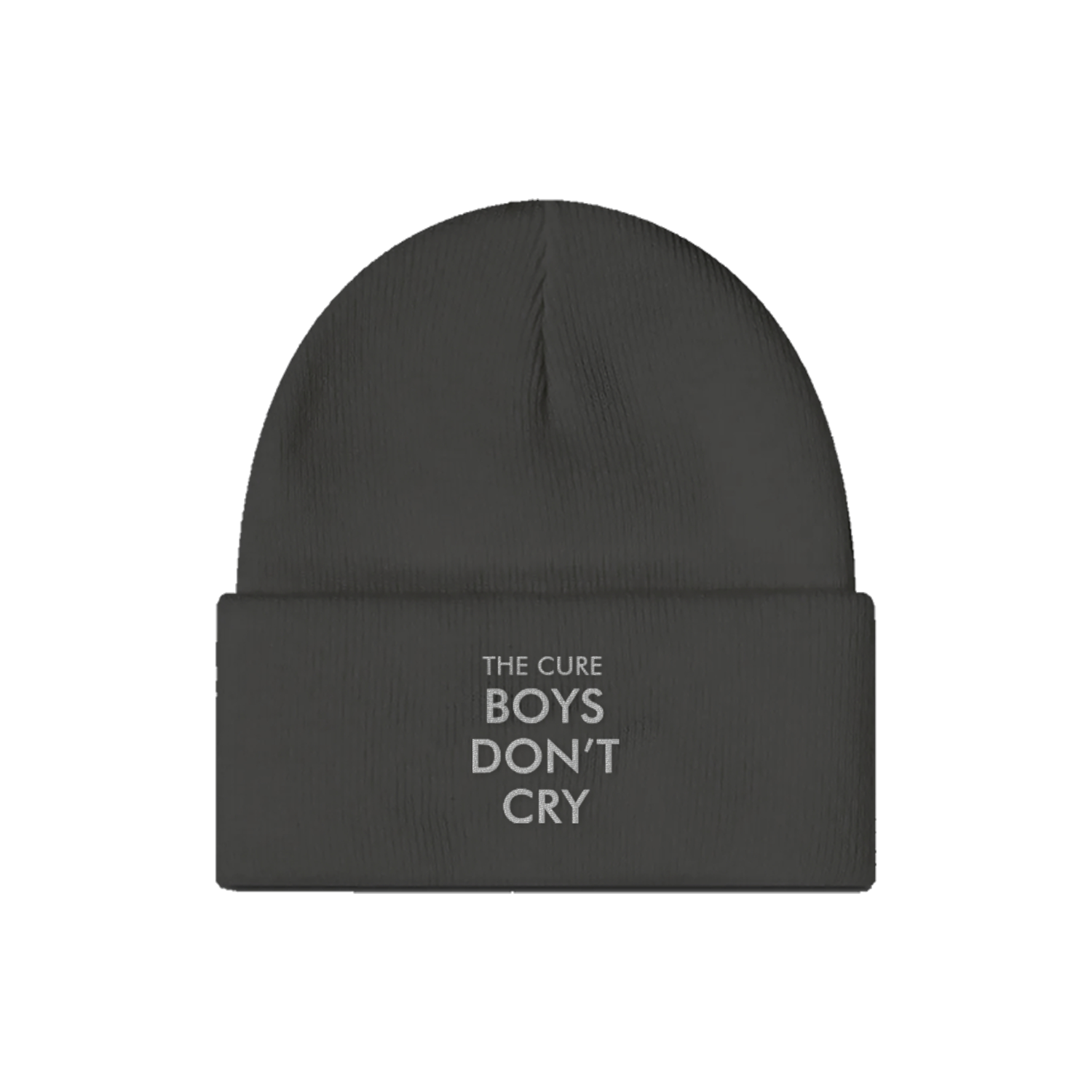 A classic fitting dark grey knit beanie featuring The Cure Boys Don't Cry embroidered on the front.