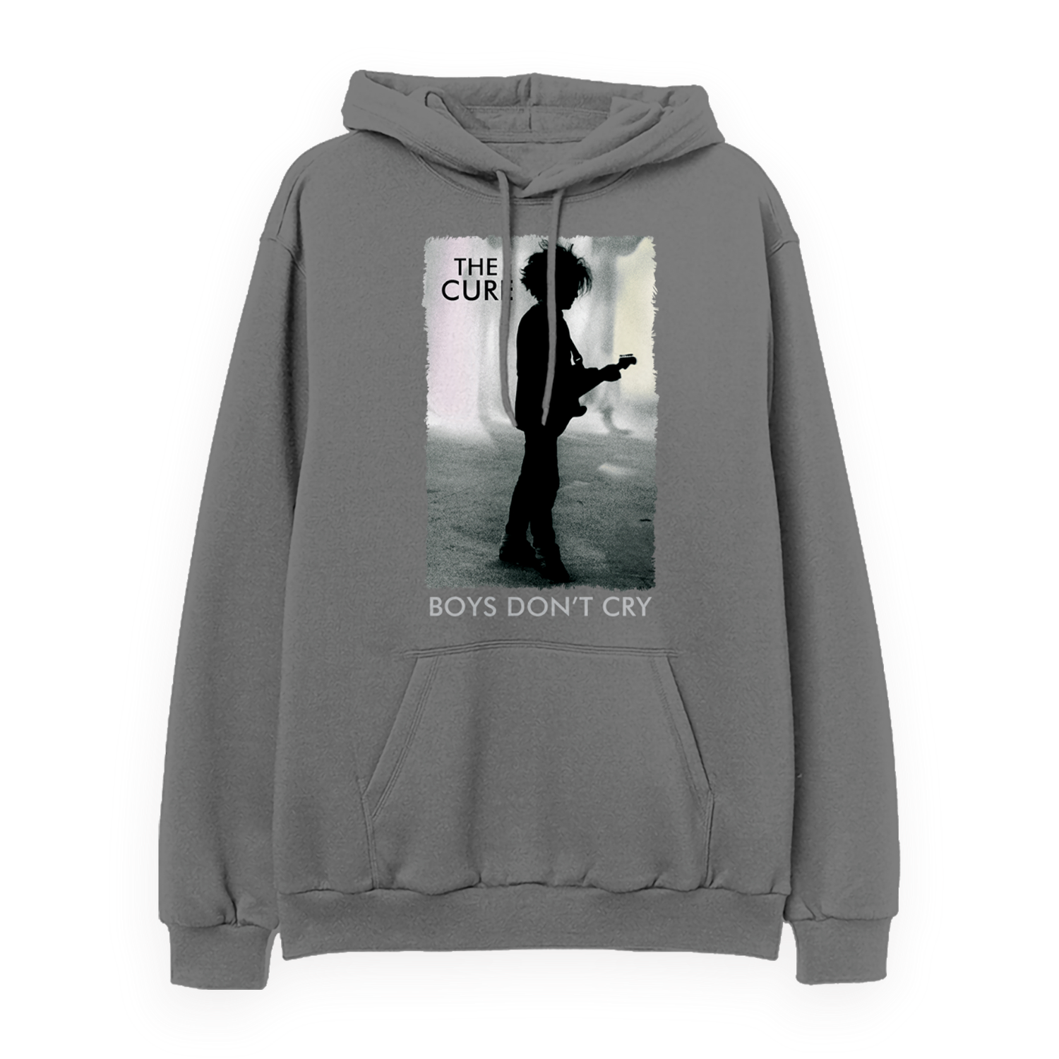 Classic fitting unisex pullover hoodie in charcoal featuring a design inspired by The Cure's single "Boys Don't Cry" printed on the front and back. Constructed from 50% cotton, 50% polyester.