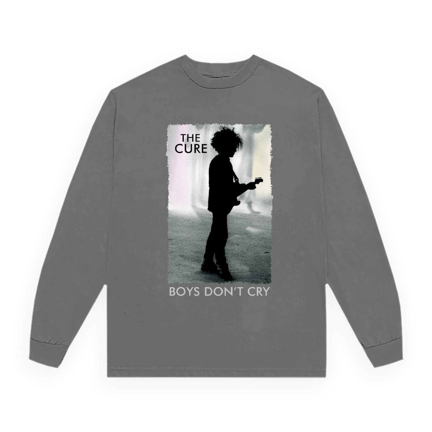 Classic fitting unisex long sleeve in charcoal featuring a design inspired by The Cure's single "Boys Don't Cry" printed on the front and back. Constructed from 100% cotton.