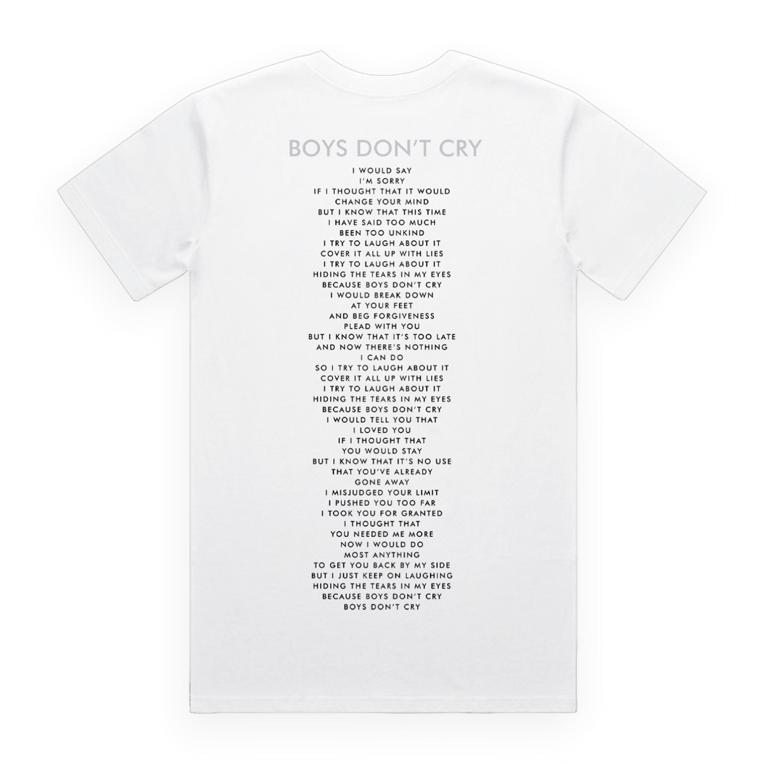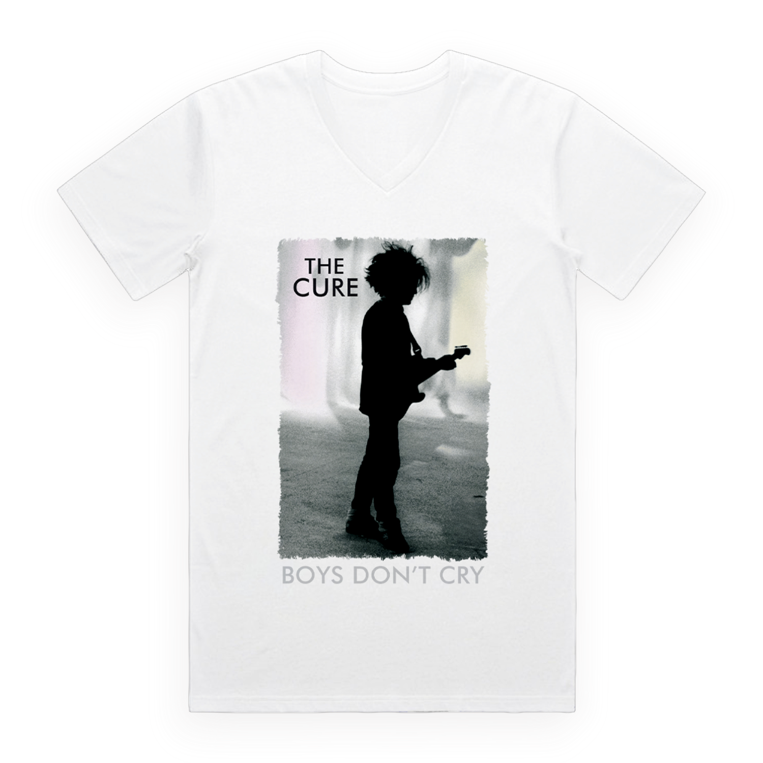 Classic fitting unisex v-neck tee in white featuring a design inspired by The Cure's single "Boys Don't Cry" printed on the front and back. Constructed from 100% cotton.