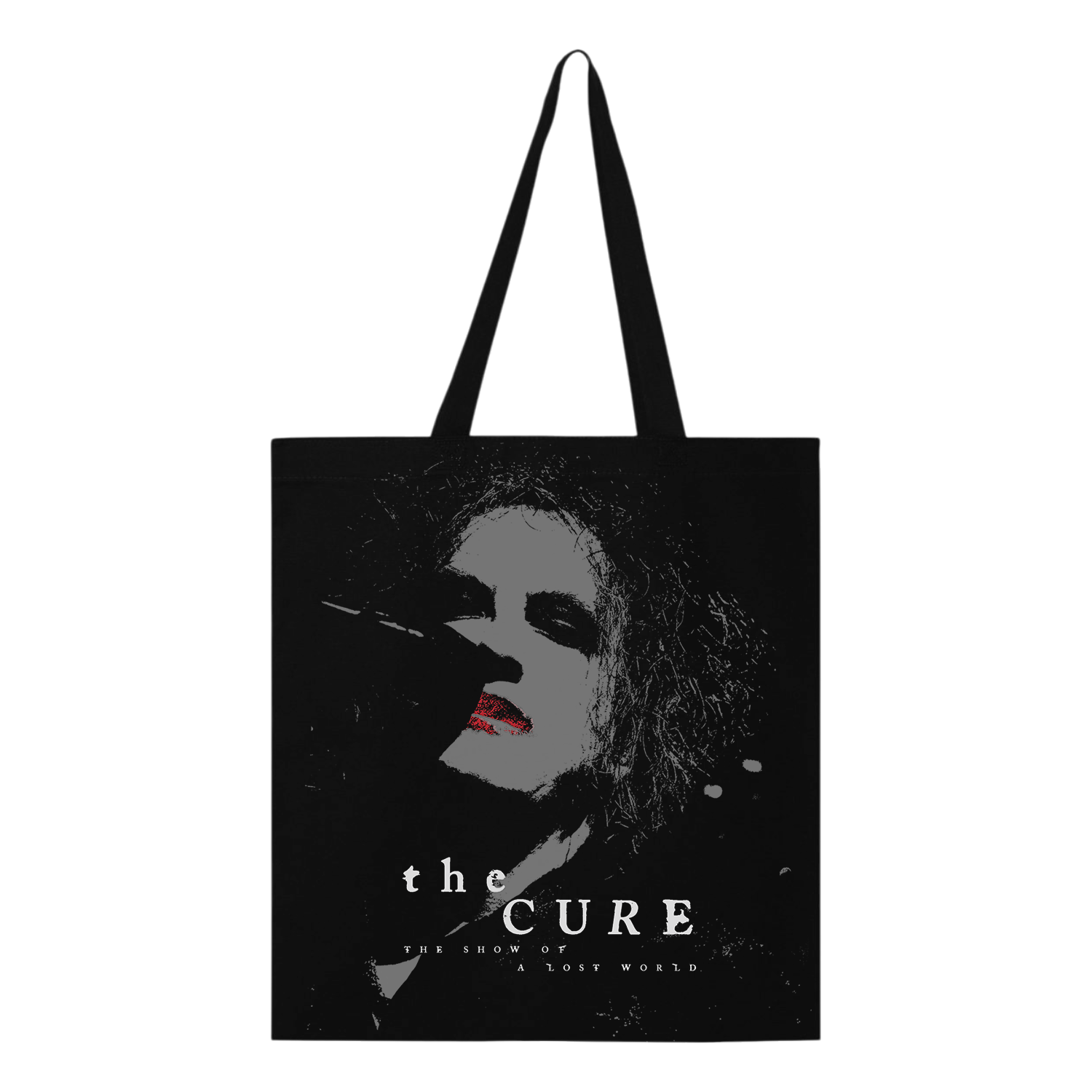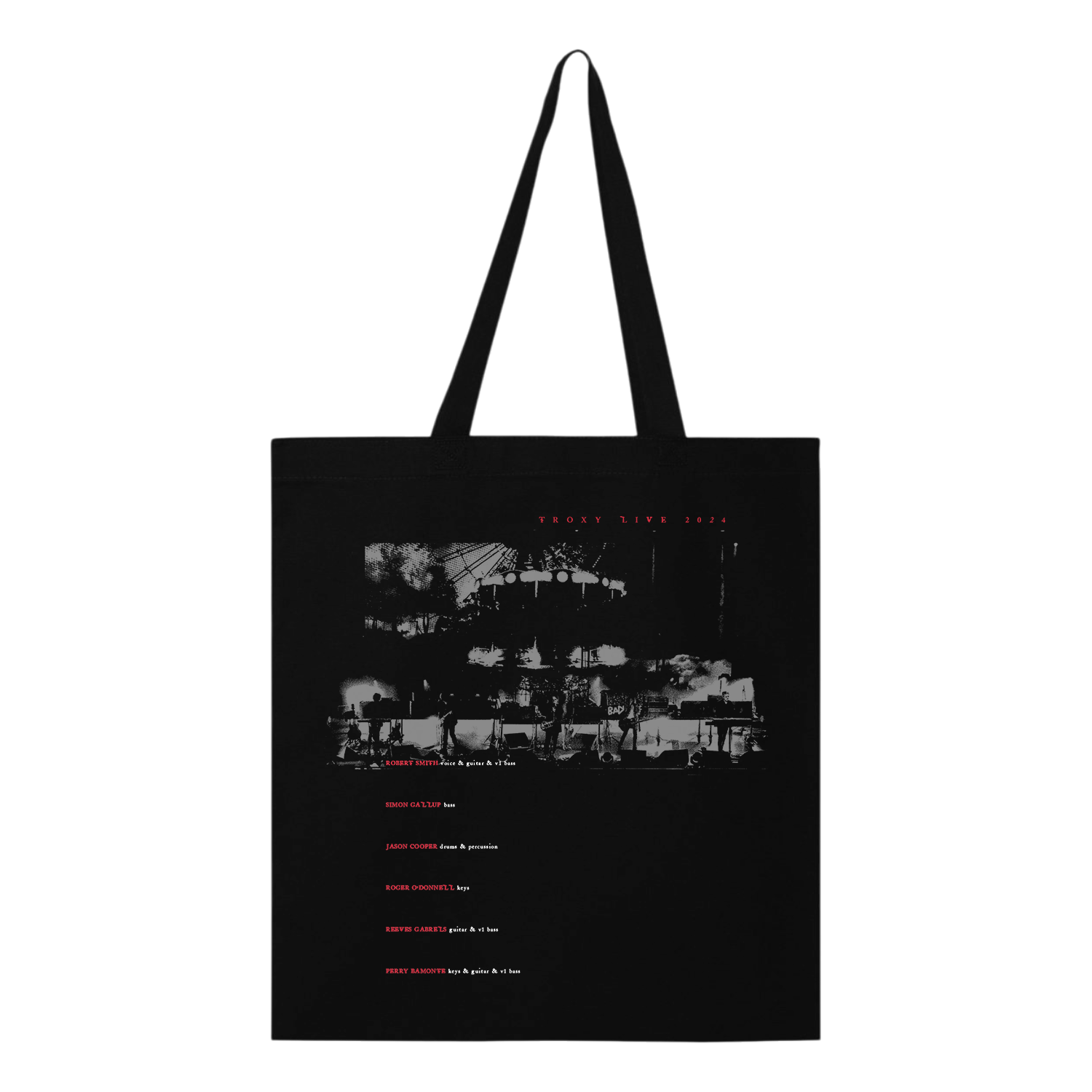 Black tote bag featuring a design inspired by The Show Of A Lost World: Troxy Live 2024 printed on both sides. 100% heavy cotton canvas. Tote bag measures 14"W x 16"H.